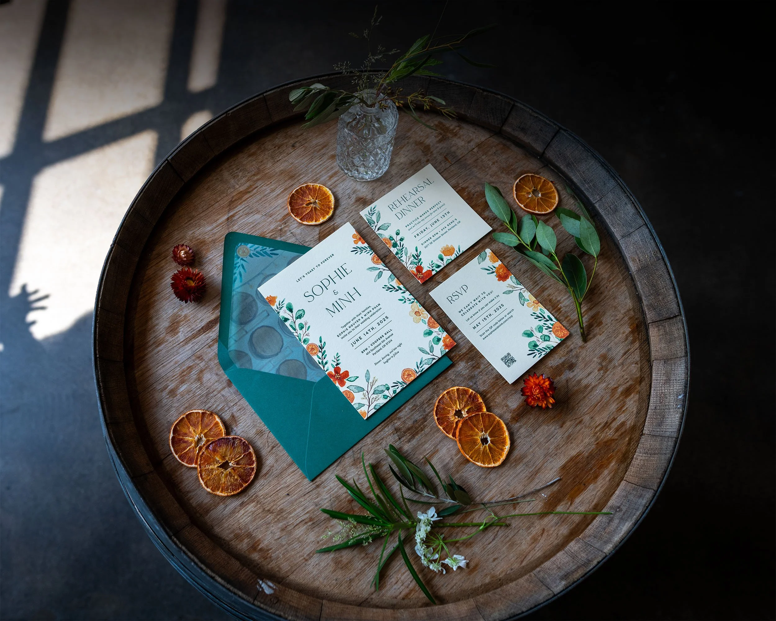 Watercolor wedding invitations & signage for modern Oregon couples.