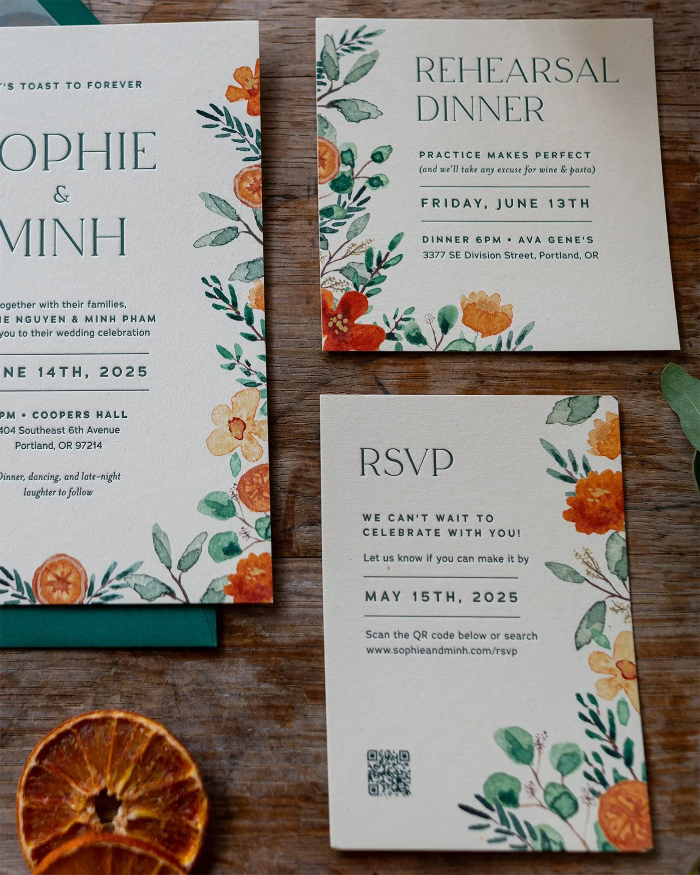 These semi-custom invitation suites and day-of collections all begin with hand-painted watercolor artwork and are brought to life through thoughtful, intentional design. Each piece is created to feel cohesive, elevated, and uniquely yours — without starting entirely from scratch with a custom process.